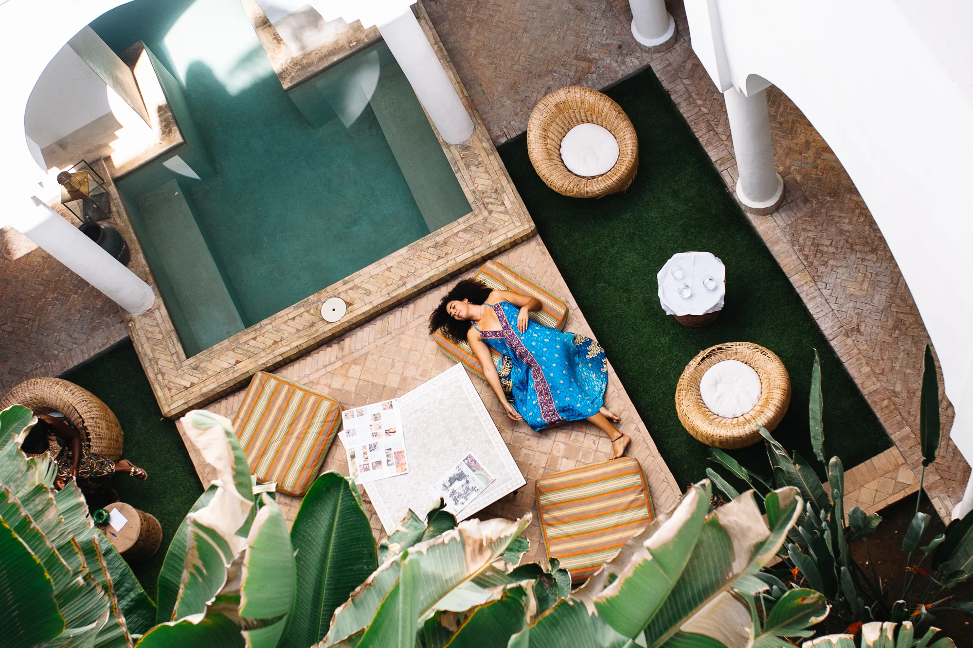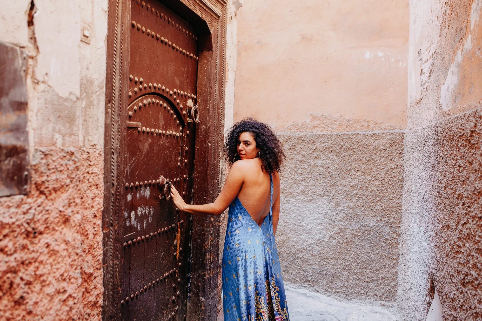 This shoot took place in Marrakech. I was staying at the Riad Capaldi which is incredibly authentic and ideal for what I had envisioned. We mostly shot inside the Riad, but ventured outside as I wanted to capture the piercing blue dress against the gorgeous red dusty walls.