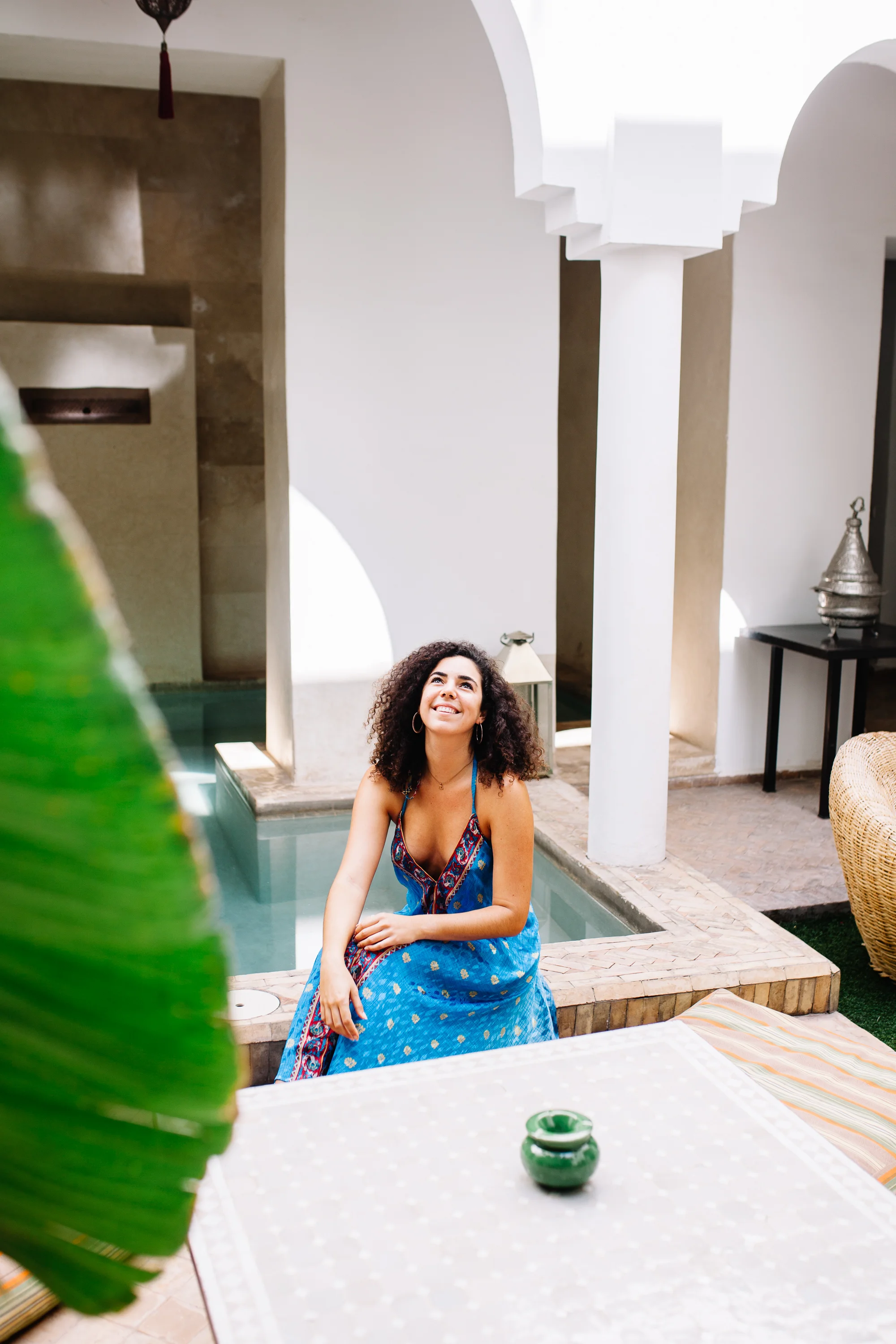 I was so happy when I found out that the shoot was in Marrakech as it is the most magical city in Morocco! We shot at a beautiful Riad close to the old medina where I had the chance to meet Meg, the photographer. She was laid back and so much fun, which put me at ease straight away. I tried on the dress and loved the vibrant colour and how it felt on the skin which made me enjoy the shoot even more. My favourite photo is the one below where Meg is sneaking up behind the palm leaves trying to take a photo.